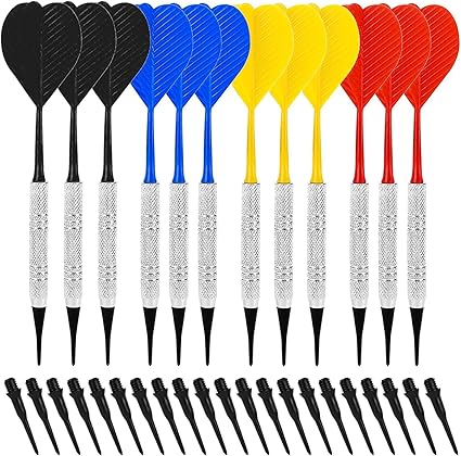 • 4 dardos de colores: los dardos de punta suave de 4 colores son muy bonitos, el juego de dardos con punta de plástico no solo es adecuado para la práctica profesional, sino también para la diversión de la fiesta. Te relajará y es perfecto para principiantes o actividades de ocio en interiores. Colores: rojo, negro, azul, amarillo con 100 agujas de dardos de plástico.