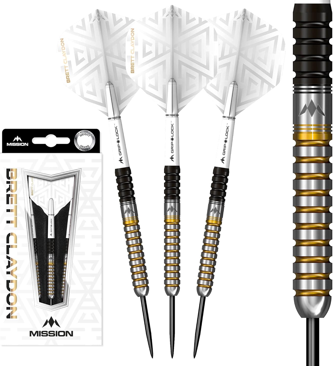 • Los dardos Mission Brett Claydon cuentan con un diseño de barril recto y nariz toro, recubiertos con un revestimiento PVD negro y dorado.